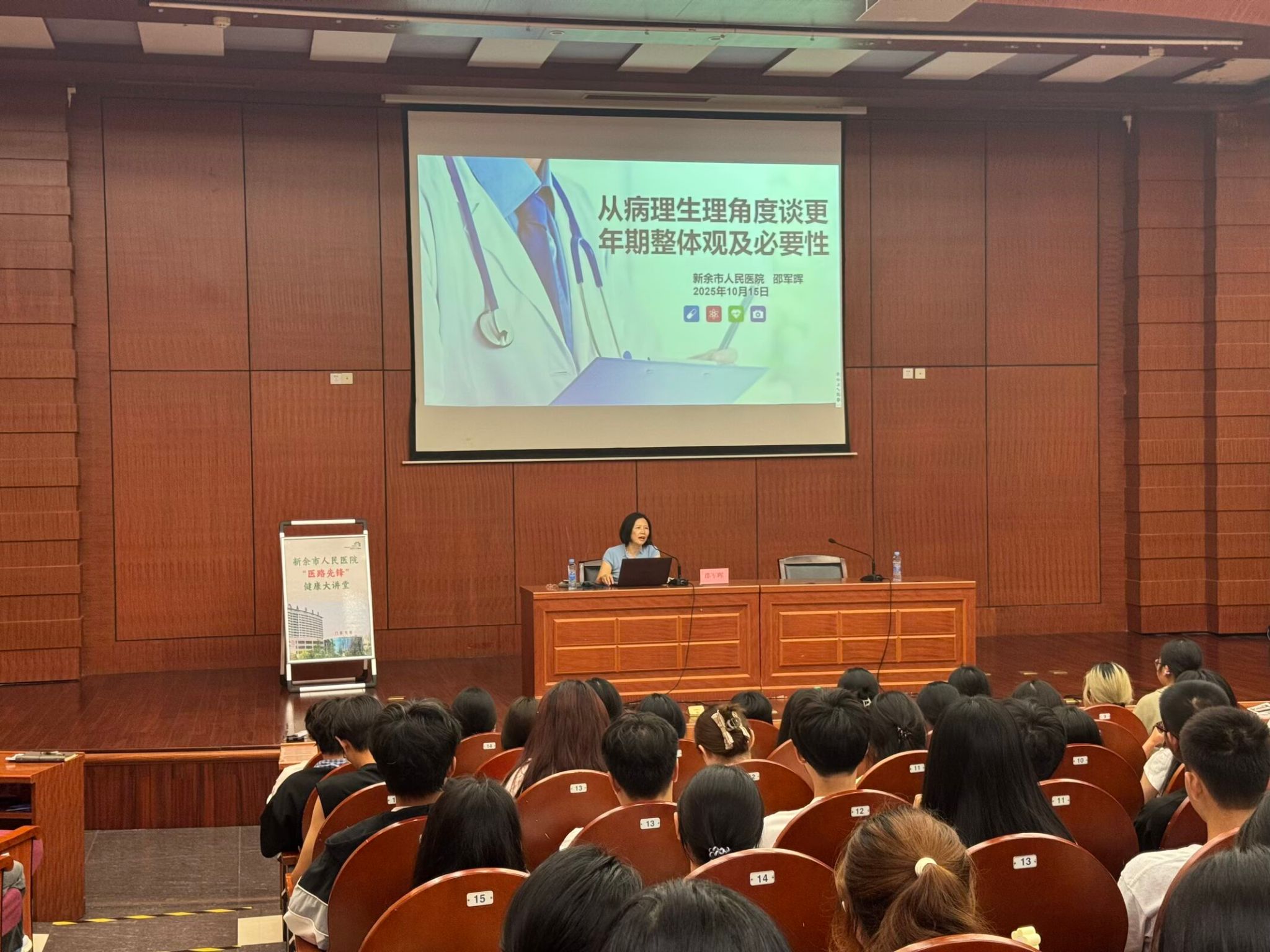 邵军晖围绕女性“更年期”的概念、成因与常见症状,展开了系统而生动的健康科普。她以图文并茂的方式,深入浅出地阐释了女性更年期的生理特征、典型临床表现、远期健康风险、常见认识误区及科学应对策略,倡导大家积极关注自身健康,理性看待更年期这一生命阶段。她特别提醒在场师生,应保持良好的生活方式与平和心态,正确认识激素治疗,以积极、从容的姿态拥抱变化,度过一个优雅而体面的更年期。