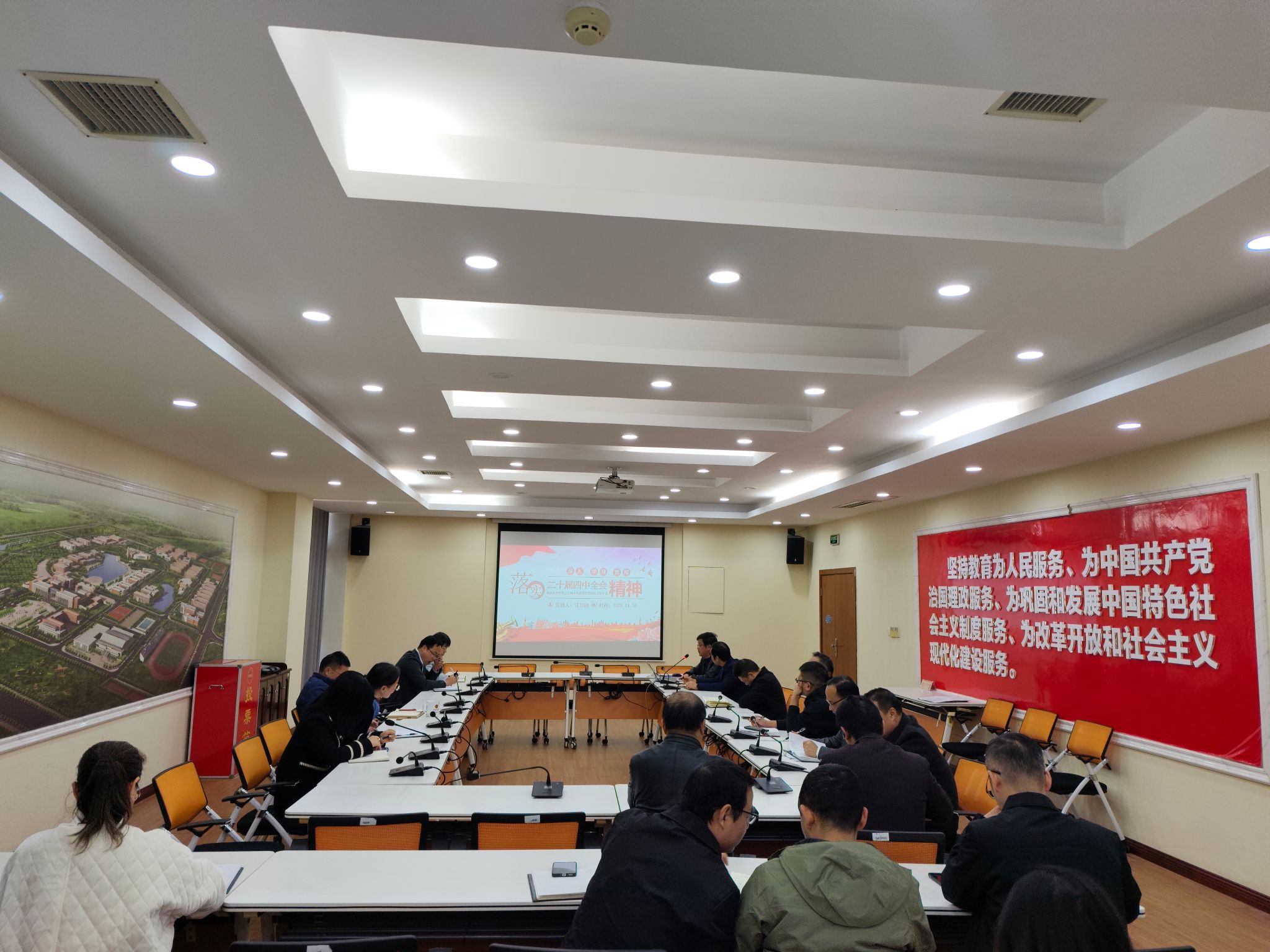 2025年11月26日下午,机关党委与后勤保障党委在行政楼一楼会议室,共同举办了党的二十届四中全会精神专题宣讲会。学校宣讲团成员、新文科新工科中心主任江训艳副教授作主题报告,机关各支部书记、支部委员和部分党员代表参加学习。